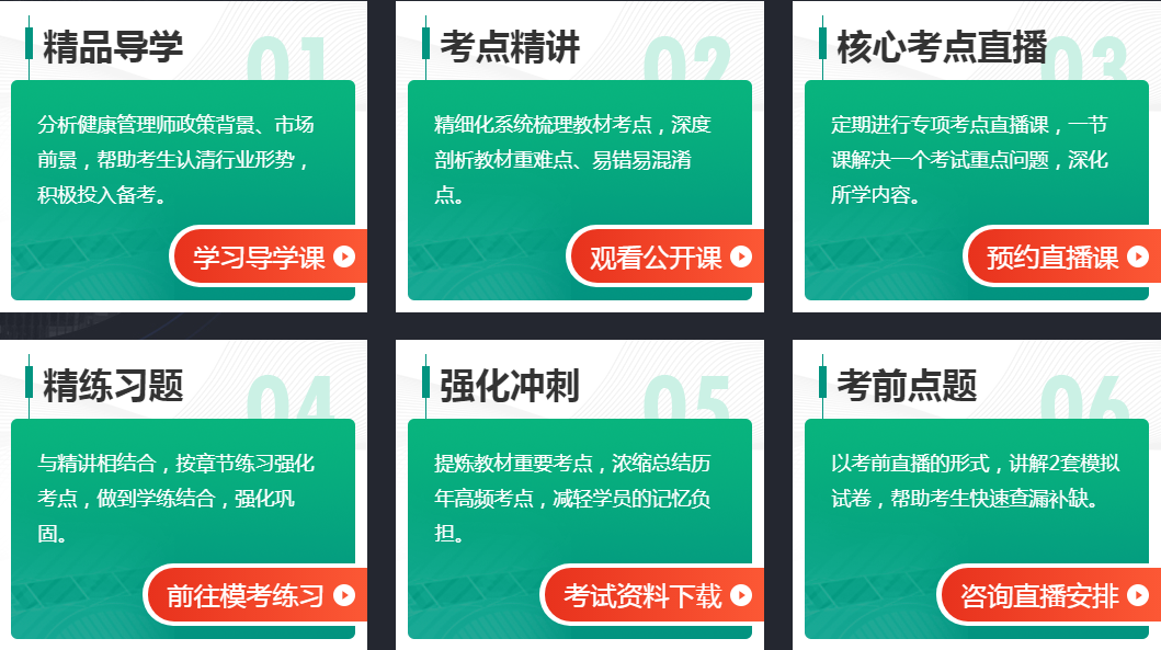 | 第一章健康管理概论 | 0~1 | 5-6道 | 1天 | 1.健康管理的概念和服务的标准化、量化、个体化的具体特点 2.健康管理的基本步骤、具体目标 3.健康管理的发展趋势 4.基本卫生保健的内容、原则、特点及其意义 5.基本卫生保健的目标和策略 | 本章节内容简单,易于理解,记忆为主。 |